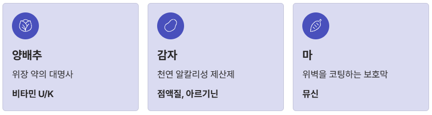 - ② 감자: 천연 알칼리성 제산제 (점액질, 아르기닌)