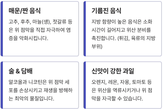 - 술 & 담배: 알코올과 니코틴은 위 점막 세포를 손상시키고 재생을 방해하는 최악의 물질입니다.