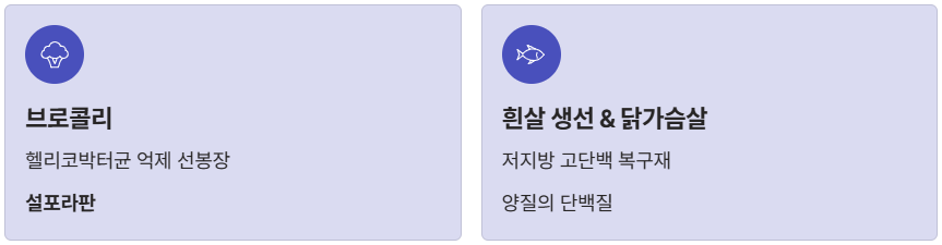 브로콜리의 설포라판은 단순한 항암 효과를 넘어, 위염의 주범 중 하나인 헬리코박터 파일로리균의 활성을 억제하는 효능이 보고되고 있어요. 또 위 점막이 손상되면 회복을 위해 단백질이 필수적인데, 이때 기름기가 적은 흰 살 생선이나 닭가슴살은 소화 부담을 최소화하면서도 양질의 단백질을 공급해 준답니다.