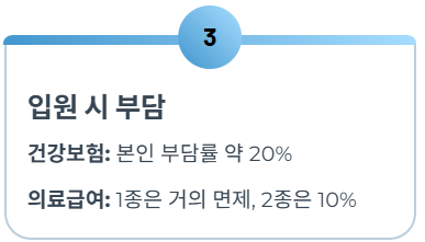 - 2. 1종 vs. 2종 혜택 차이: 1종은 입원 시 본인 부담금이 거의 없지만, 2종은 본인 부담금이 일부 발생합니다. 중증 질환 여부, 근로 능력 유무에 따라 유형이 결정되니 **자신이 어느 유형에 해당하는지** 미리 파악하는 것이 중요합니다.