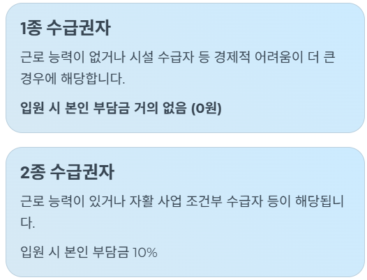 | 구분 | 1종 수급권자 (근로능력 없음/시설수급자 등) | 2종 수급권자 (근로능력 있음/자활 사업 조건부 등) |