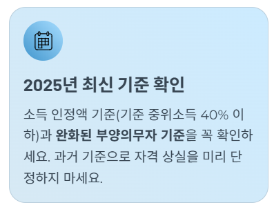 - 1. 2025년 최신 기준 확인: 소득 인정액 기준(기준 중위소득 40% 이하)은 물론, **완화된 부양의무자 기준**을 꼭 확인하여 자격 상실을 미리 단정하지 마세요.