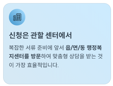 - 3. 신청은 무조건 관할 센터에서: 복잡한 서류 준비에 앞서, **읍/면/동 행정복지센터를 방문**하여 맞춤형 상담을 통해 정확한 정보를 얻고 절차를 밟는 것이 가장 효율적입니다.