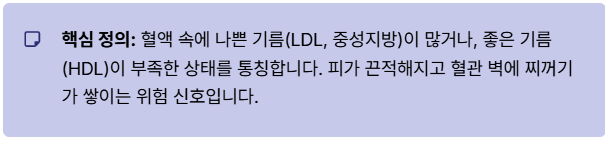 가장 먼저, 이 질환의 정확한 정의부터 알아볼까요? **이상지질혈증이란** 혈액 속에 지질(콜레스테롤, 중성지방)이 비정상적으로 많거나, 반대로 이로운 지질이 부족한 상태를 통칭하는 말이에요. 쉽게 말해, 피가 끈적해지고 혈관 벽에 지방 찌꺼기가 쌓이기 시작하는 위험한 신호인 거죠.