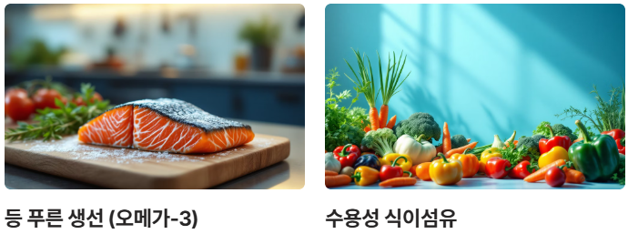 - 불포화지방산 섭취: 견과류, 올리브 오일, 등 푸른 생선(고등어, 연어)에 많은 오메가-3 지방산은 **LDL 콜레스테롤 수치**를 낮추고 **중성지방** 감소에 큰 도움을 줍니다.