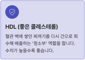 | 좋은 콜레스테롤 | **HDL 콜레스테롤** | 혈관 벽에 쌓인 콜레스테롤을 다시 간으로 회수하여 배출하는 청소부 역할을 합니다. |