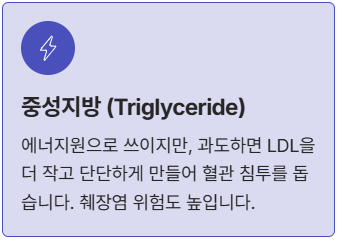 | 문제성 지질 | **중성지방** | 에너지원으로 쓰이며, 과도하면 LDL 콜레스테롤 수치를 높이고 췌장염 위험을 증가시킵니다. |
