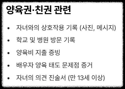 - 양육권/친권: 아이와 함께하는 긍정적인 상호작용 기록(사진, 메시지), 아이의 학교/병원 기록, 배우자의 양육 태도 문제점 증거 등을 체계적으로 기록하세요.