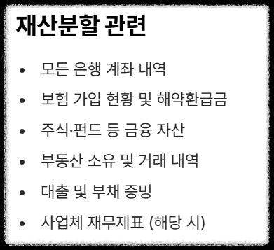 - 재산분할: 모든 은행 계좌, 보험, 주식, 부동산 소유 현황 등 재산 목록 및 거래 내역을 미리 확보하세요. 재산 명시 명령을 신청할 수도 있지만, 미리 확보하면 시간을 아낄 수 있습니다.