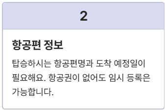 | 항공편 정보 | 탑승하시는 항공편명과 도착 예정일이 필요해요. (항공권이 없어도 임시 등록은 가능하지만, 편명이 확실해야 합니다.) |
