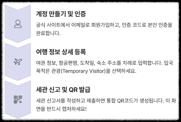 - **가장 중요한 순간!** 모든 절차를 완료하면 **통합된 QR코드**가 생성됩니다. 이 화면을 반드시 캡처해 주세요. (입국 심사대와 세관 검사대에서 모두 사용됩니다.)