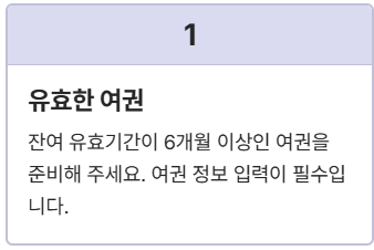 | 유효한 여권 | 잔여 유효기간이 6개월 이상인 여권을 준비해 주세요. (여권 정보 입력 필수) |