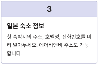 | 일본 숙소 정보 | 첫 숙박지의 주소, 호텔명, 전화번호를 미리 알아두세요. (에어비앤비 주소도 가능) |