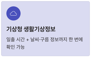 - ② 기상청 생활기상정보 - 날씨 변수까지 한 번에 기상청은 기본적인 일출 일몰 시간은 물론, 해당 시간대의 날씨와 구름 정보를 함께 제공합니다. 해를 볼 수 있을지 확률까지 예측할 수 있어 여행 당일의 실시간 계획에 큰 도움이 됩니다. (국가정부: 기상청 날씨누리)