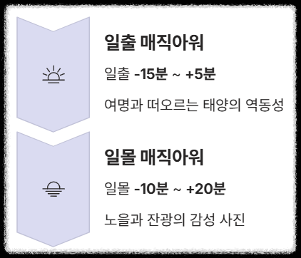 | 일몰 매직아워 | 일몰 시간 **-10분** ~ 일몰 시간 **+20분** | 노을과 잔광(殘光)을 배경으로 한 감성 사진 |