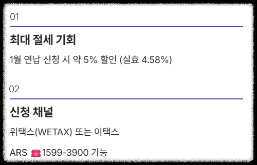 - 납부 기한을 놓쳤다면? 1월 연납 기한을 놓쳤다고 해서 페널티가 있는 건 아니에요. 다만, 다음 신청 월(3월, 6월, 9월)의 할인율이 적용된 고지서를 다시 받거나, 6월과 12월 정기분으로 납부해야 합니다.