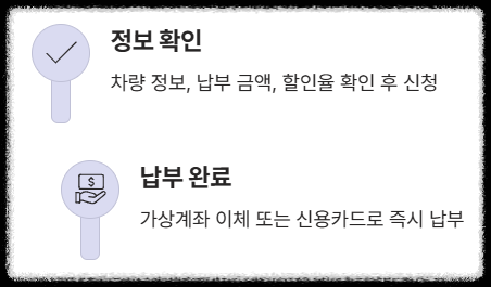 - 정보 확인 및 신청: 차량 정보와 납부 금액, 할인율을 확인하고 '신청' 클릭.