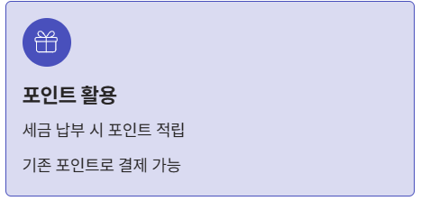 - 납부: 고지된 금액을 바로 가상 계좌 이체 또는 신용카드로 납부하면 끝!