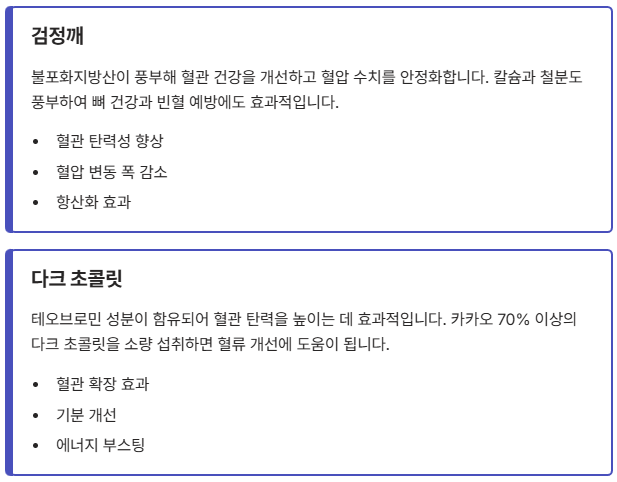 - 다크 초콜릿: 테오브로민 성분이 함유되어 혈관 탄력을 높이는 데 효과적입니다.