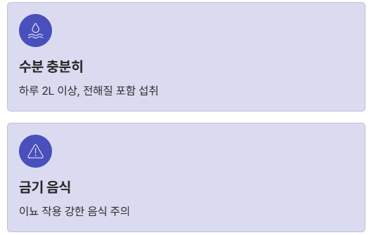 ✅ 수분: 하루 2L 이상, 전해질 포함 섭취
