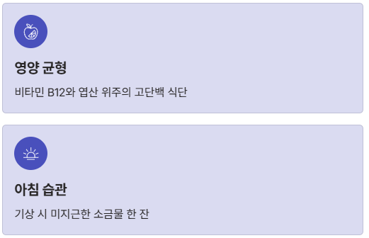 | 빈혈 동반 | 간, 시금치, 계란 | 비타민 B12 보충 |