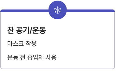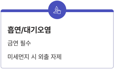 | **흡연/대기 오염** | 기도 염증 악화, 호흡 곤란 | 금연, 미세먼지 시 외출 자제 |