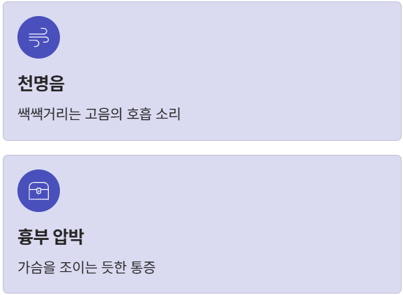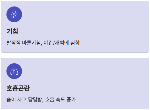 | **기침** | 발작적이며 마른 기침(건성), 호흡곤란 유발 | 야간/새벽 | 찬 공기, 운동, 웃음 |