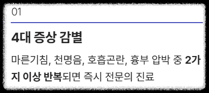 1. **4대 증상 감별:** 마른기침, 천명음, 호흡곤란, 흉부 압박 중 2가지 이상이 반복되면 즉시 전문의 진료.