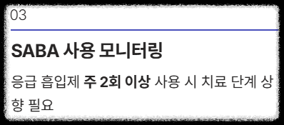 3. **SABA 사용 횟수:** 응급 흡입제 사용이 주 2회 이상이면 치료 단계를 상향 조정해야 할 시점임을 인지하세요.