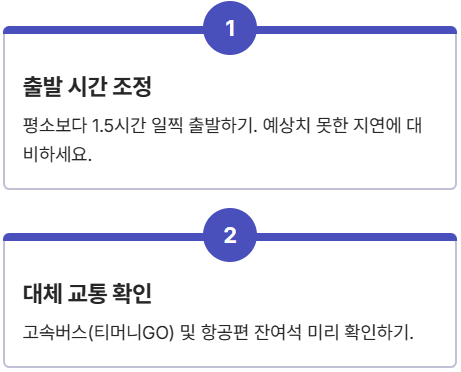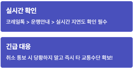 - 대체 수단 앱 설치: 고속버스/항공 앱을 미리 세팅하세요.