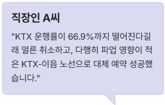 - 직장인 A씨: "KTX 운행률이 66.9%까지 떨어진다길래 얼른 취소하고, 다행히 파업 영향이 적은 KTX-이음 노선으로 대체 예약 성공했습니다."