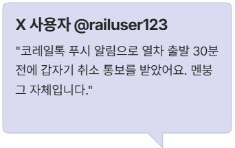 - X 사용자 @railuser123: "코레일톡 푸시 알림으로 열차 출발 30분 전에 갑자기 취소 통보를 받았어요. 멘붕 그 자체입니다."