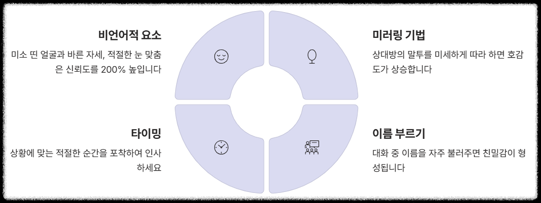 상대방의 말투를 미세하게 따라 하는 '미러링'과 이름을 자주 불러주는 것이 호감도를 높입니다.