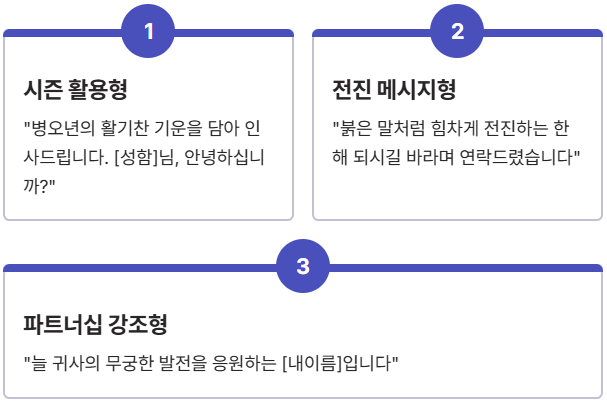 "병오년의 활기찬 기운을 담아 인사드립니다. [성함]님, 안녕하십니까?"(전문성 강조)"붉은 말처럼 힘차게 전진하는 한 해 되시길 바라며 연락드렸습니다."(시즌 적절성)"늘 귀사의 무궁한 발전을 응원하는 [내이름]입니다."(파트너십 강조)"지난 프로젝트의 성공적인 협력에 감사드리면 새해 첫 소식을 전합니다."(유대감)"새로운 기회가 가득한 2026년, 함께 협력할 수 있어 영광입니다."(긍정적 비전)"바쁘신 와중에 시간 내주셔서 감사합니다. [부서]의 [이름]입니다."(예의와 격식)"효율과 성장이 기대되는 올 한 해, 실질적인 도움을 드리고자 합니다."(가치 제안)"보내주신 피드백 덕분에 더 나은 제안을 준비할 수 있었습니다."(경청의 태도)"함께 도전하고 성취하는 파트너로서 최선을 다하겠습니다."(신뢰 형성)