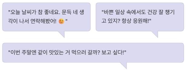 - "오늘 날씨가 참 좋네요. 문득 네 생각이 나서 연락해봤어! 😊"