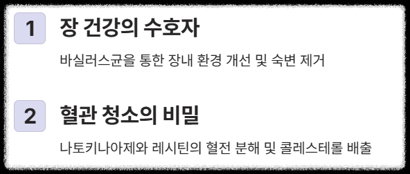 - 나토키나아제: 이는 혈액의 혈전(피떡)을 녹이는 강력한 효소로, 혈액 순환 개선과 혈압 조절에 결정적인 역할을 해 '청국장가루 혈관 건강'의 핵심이라 할 수 있습니다.