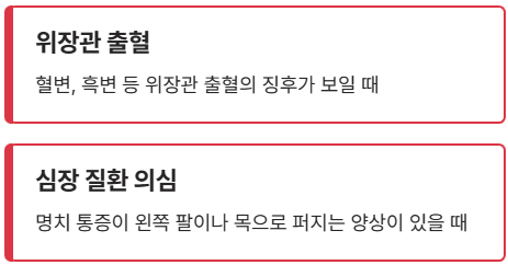 - 명치 통증이 왼쪽 팔이나 목으로 퍼지는 양상이 있을 때 (심장 질환 가능성 배제 불가)