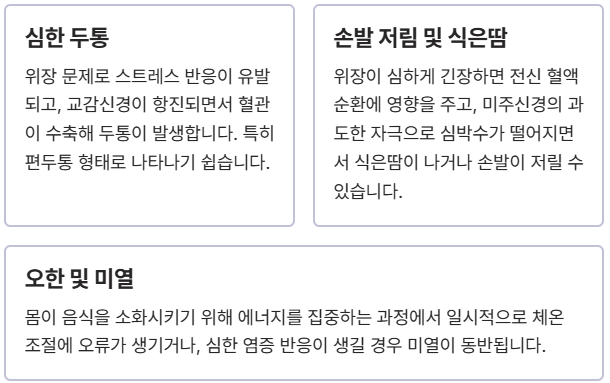 - 손발 저림 및 식은땀: 위장이 심하게 긴장하면 전신 혈액순환에 영향을 주고, 미주신경(부교감신경)의 과도한 자극으로 심박수가 떨어지면서 식은땀이 나거나 손발이 저릴 수 있습니다.