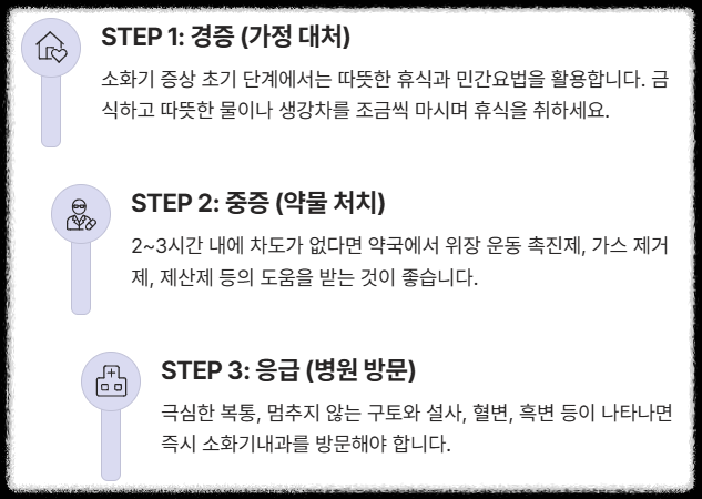 막상 체했을때 대처법을 찾으려면 너무 많은 정보가 쏟아지죠? 제가 증상의 심각도에 따라 3단계로 나눠서 가장 효과적인 대처법을 알려드릴게요. 핵심은 '증상을 스스로 판단하고 적절한 타이밍에 개입하는 것'이에요.