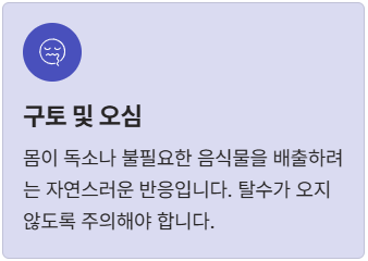 - 구토 및 오심: 몸이 독소나 불필요한 음식물을 배출하려는 자연스러운 반응이기도 해요. 이 과정에서 탈수가 오지 않도록 주의해야 합니다.
