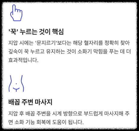 2. '꾹' 누르는 것이 핵심: 지압 시에는 '문지르기'보다는 해당 혈자리를 정확히 찾아 깊숙이 꾹 누르고 유지하는 것이 소화기 막힘을 푸는 데 더 효과적입니다.