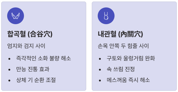 체했을 때 혈자리는 무조건 세 가지를 기억하세요. 합곡혈(소화), 내관혈(구토/울렁거림), 족삼리혈(위장 강화)! 이 세 곳은 체증으로 인한 급체, 메스꺼움, 소화불량에 가장 효과적인 혈자리로 한의학에서 널리 활용됩니다.