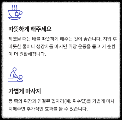 1. 따뜻하게 해주세요: 체했을 때는 배를 따뜻하게 해주는 것이 좋습니다. 지압 후 따뜻한 물이나 생강차를 마시면 위장 운동을 돕고 기 순환이 더 원활해집니다.