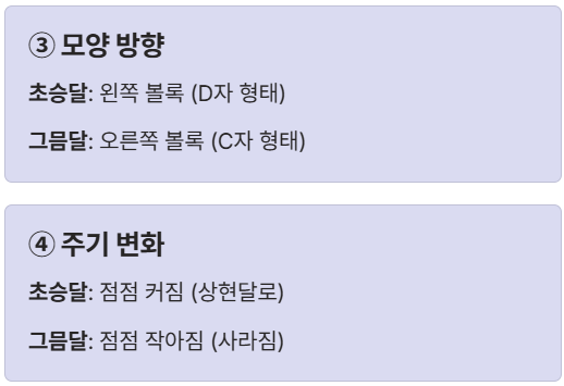 | ④ 주기 변화 | 점점 커짐 (상현달로) | 점점 작아짐 (사라짐) |
