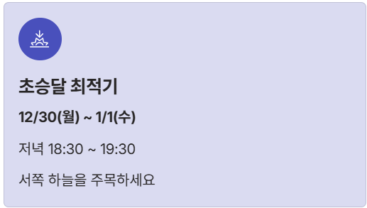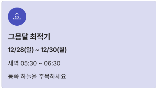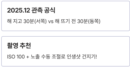 - 그믐달 최적기: 12/28(일) ~ 12/30(월) | 새벽 05:30 ~ 06:30 | 동쪽 하늘