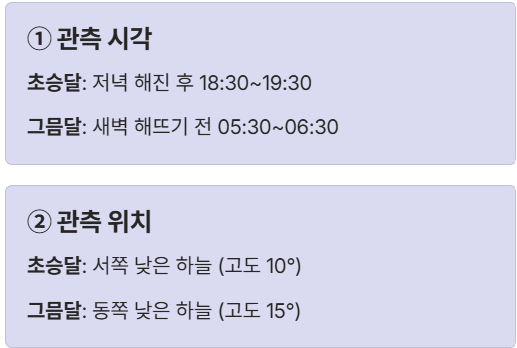 | ① 관측 시각 | 저녁 해진 후 (18:30~19:30) | 새벽 해뜨기 전 (05:30~06:30) |