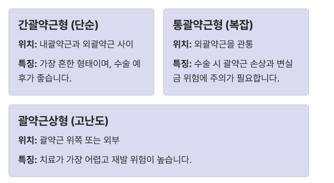 | 괄약근상형/외괄약근형 | 괄약근 위쪽 또는 외부를 크게 돌아 나가는 형태 | 치료가 가장 어렵고 재발 위험이 높습니다. |