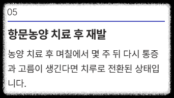 - 항문농양 치료 후 증상 재발: 항문농양으로 치료받았음에도 불구하고 며칠에서 몇 주 뒤에 다시 통증이 생기고 고름이 분비된다면, 거의 확실하게 치루로 전환된 상태라고 볼 수 있습니다.