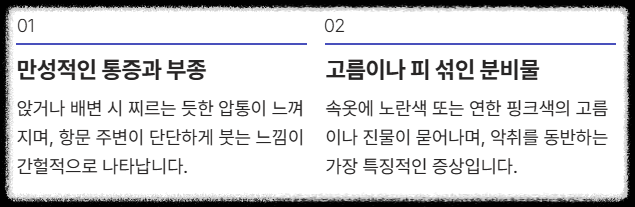 치루증상은 만성적인 염증이기 때문에 급성 항문농양처럼 폭발적인 통증이 아닌, 꽤 애매하고 간헐적인 형태로 나타나는 경우가 많아요. 그래서 많은 분들이 치핵(치질)이나 가벼운 피부 질환으로 착각하고 넘어가는 거죠. 하지만 아래 5가지 증상은 치루를 강력하게 시사하는 핵심 신호이니 꼭 기억해 두셨으면 좋겠어요.