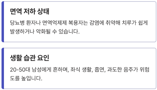 - 생활 습관: 남성(20~50대)에게 더 흔하며, 좌식근무자, 흡연, 과도한 음주 역시 위험도를 높이는 요소로 지목됩니다.
